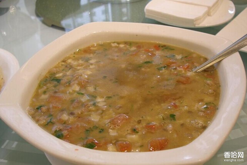 來我們焉耆縣的扁豆面旗子專營店品嘗吧!經(jīng)過我的多次打探,它其中的秘決是這樣的—第一步:用溫水浸泡扁豆四小時左右,第二步:燉富含骨髓多的牛骨湯,第三步:炒臊子(羊肉丁、土豆丁、西紅柿丁、蔥花,加入鹽,花椒)炒香后盛出,第四步:加鹽和硬面、搟薄、加菱形小塊,第五步:開水鍋中加牛骨湯,入面稍煮,灑些軟扁豆,放入炒好的臊子,調(diào)些胡椒粉,出鍋時飄些香菜花,這款湯飯中的扁豆含有多種維生素和礦物質(zhì),能健脾開胃,加之胡椒味稍濃,怪不得人們吃了以后大汗淋漓、回味無窮呢!