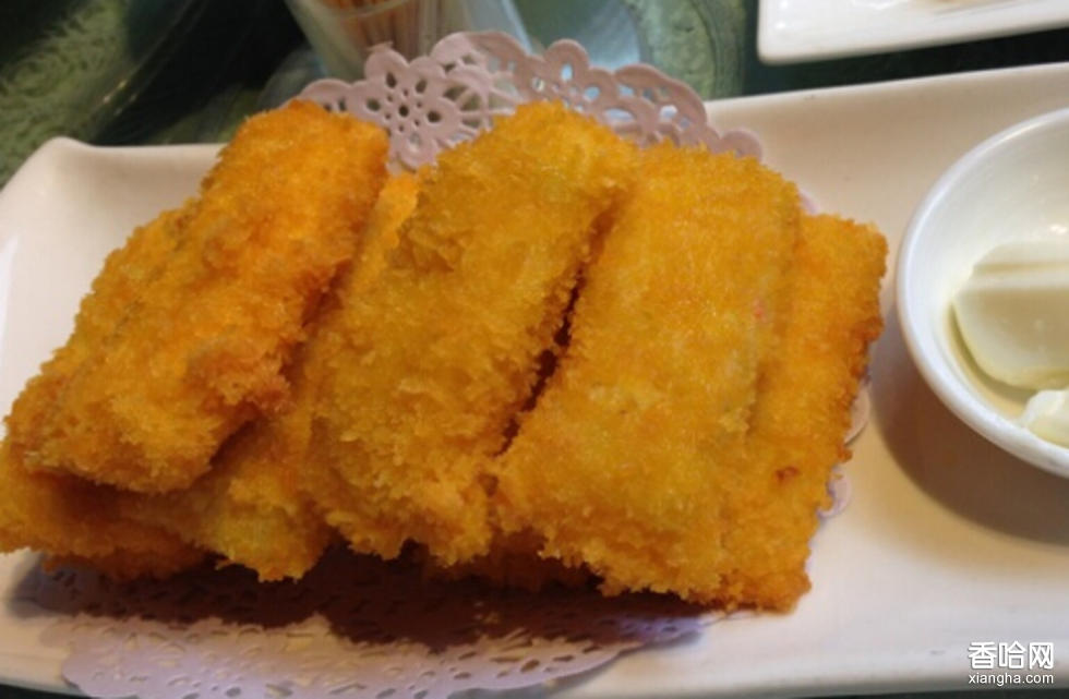 做法:把面包切成四方塊,一邊加香蕉一邊加豆沙餡,用雞蛋糊裹面包,然后放入五成油溫中炸成蛋黃色即成。在炸制的過程中一定要把握住火候。用料簡單,外脆內(nèi)嫩,酥香可口。