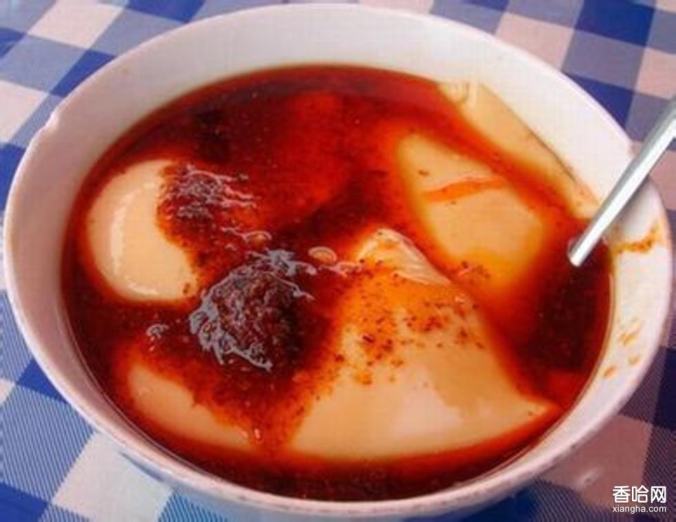 制成后顏色雪白,柔嫩光潔,翻而不散,攪而不斷。食用時,用勺舀起盛入碗內(nèi),澆上適量的調(diào)和湯,再撒上黃豆、香菜、榨菜末、辣椒油等佐料,紅白相間,風(fēng)味特異,吃起來咸辣清香,爽滑利口,香味撲鼻。