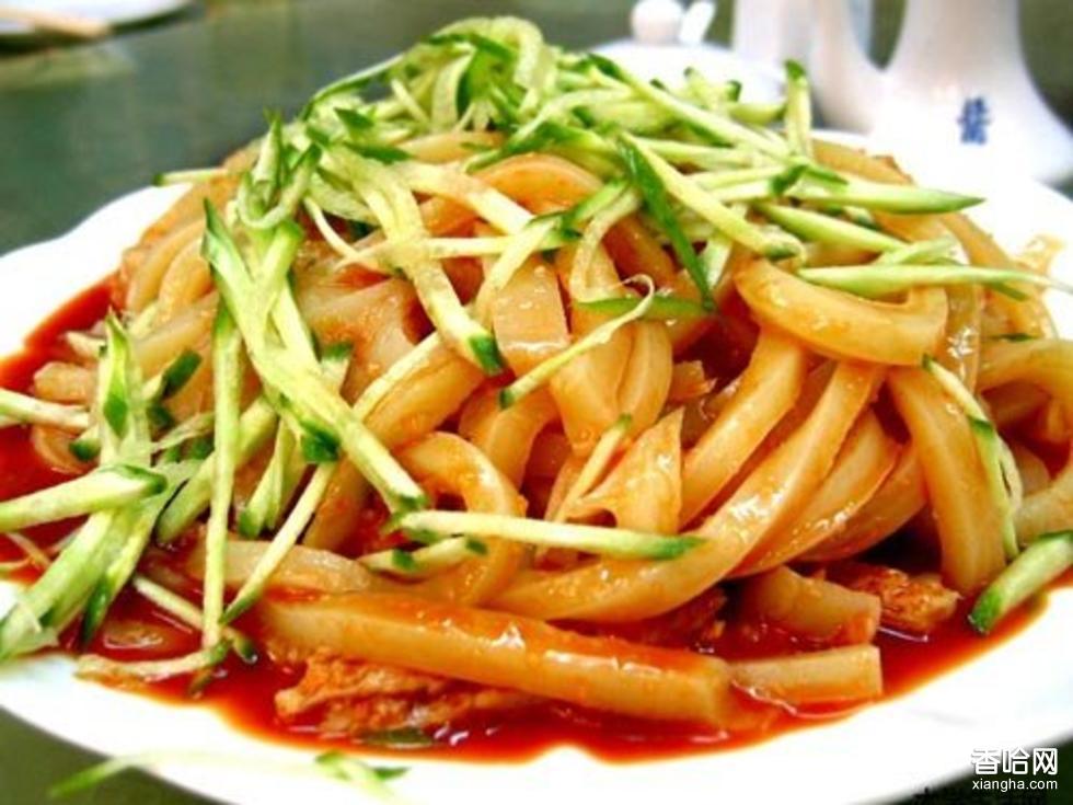 師傅當(dāng)著顧客的面,用一把幾十斤重的大刀把整張的米皮切成細(xì)條,拌上特制的辣椒油、醋和鹽,加上芹菜丁和豆芽、黃瓜絲等小菜,一碗碗看來紅通通、吃來“筋、薄、細(xì)、軟”、涼爽可口的秦鎮(zhèn)米皮就可以上桌食用了。