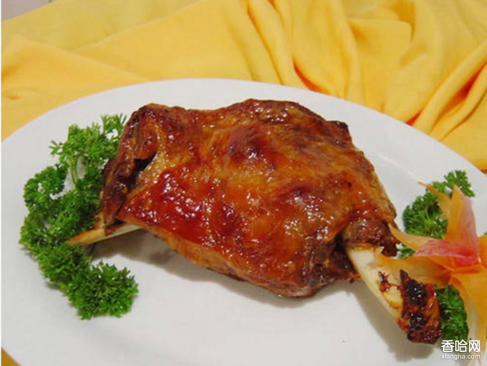 制作步驟:1.將羊腿沖洗干凈,用鐵釬子均勻地遍戳小孔,置容器里,加精鹽、花椒水腌4~6 小時。2.烤盤內(nèi)加桂皮、八角、草果、姜、番茄醬和羊湯,再放入腌過的羊腿,在羊腿上放蔥頭、番茄、芹菜。待烤箱升溫至180~200℃左右,將烤盤推進(jìn)烤箱內(nèi),每小時翻動一次,約3~4 小時,湯汁烤干,羊腿爛熟,取出裝盤,以香菜點(diǎn)綴即成。
