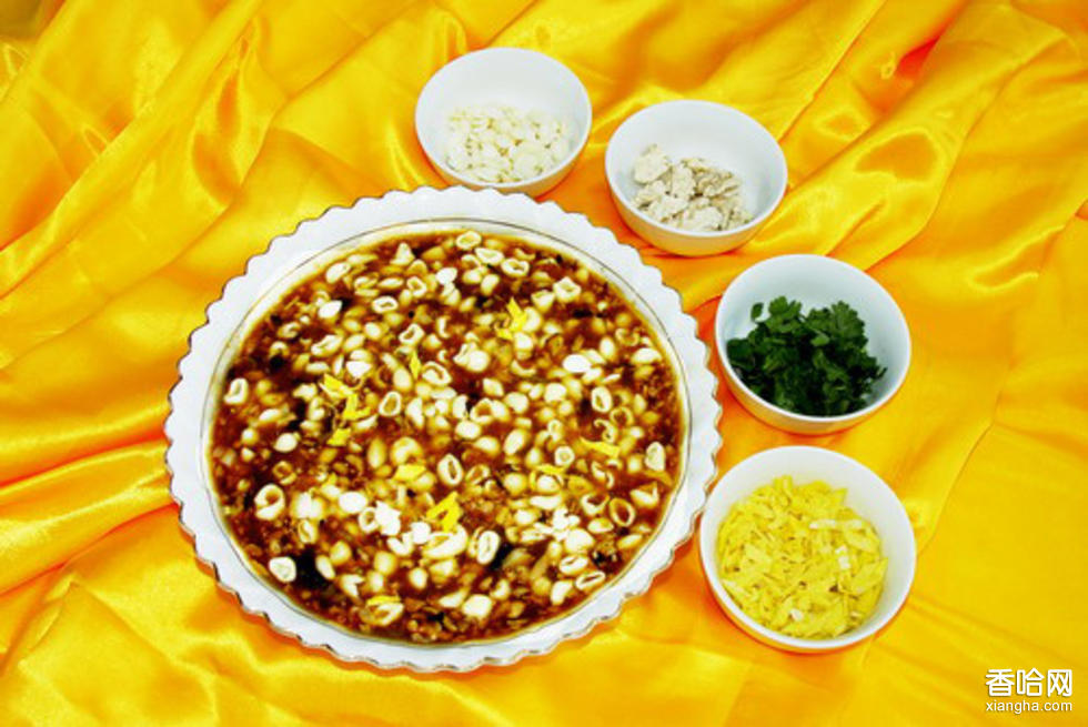 在陜西農(nóng)村,也有用小麥面蒸涼皮的,農(nóng)村人一般叫釀皮。釀皮的吃法和做法和米面皮無(wú)差異。但在西安回民中,釀皮的吃法卻與眾不同,它除了放醋、鹽、味素、辣椒油外,還要放芝麻醬,吃來(lái)又別有風(fēng)味,所以在西安,人們又把回民的這種涼皮叫做麻醬涼皮。