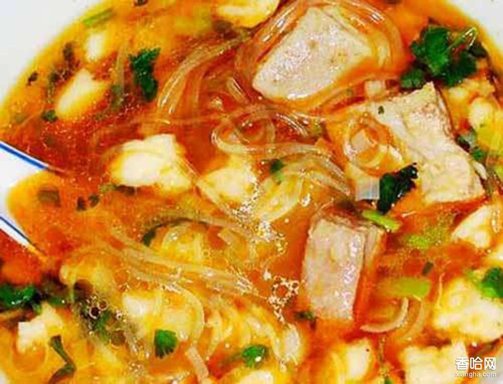 4.出售時(shí)將面條放碗里,用調(diào)好的煎湯透幾遍,將面透熱,澆上原湯,再加生姜末,生蔥(韭)花及油潑辣子,即稱咸湯面。加上羊血的稱羊血咸湯面。