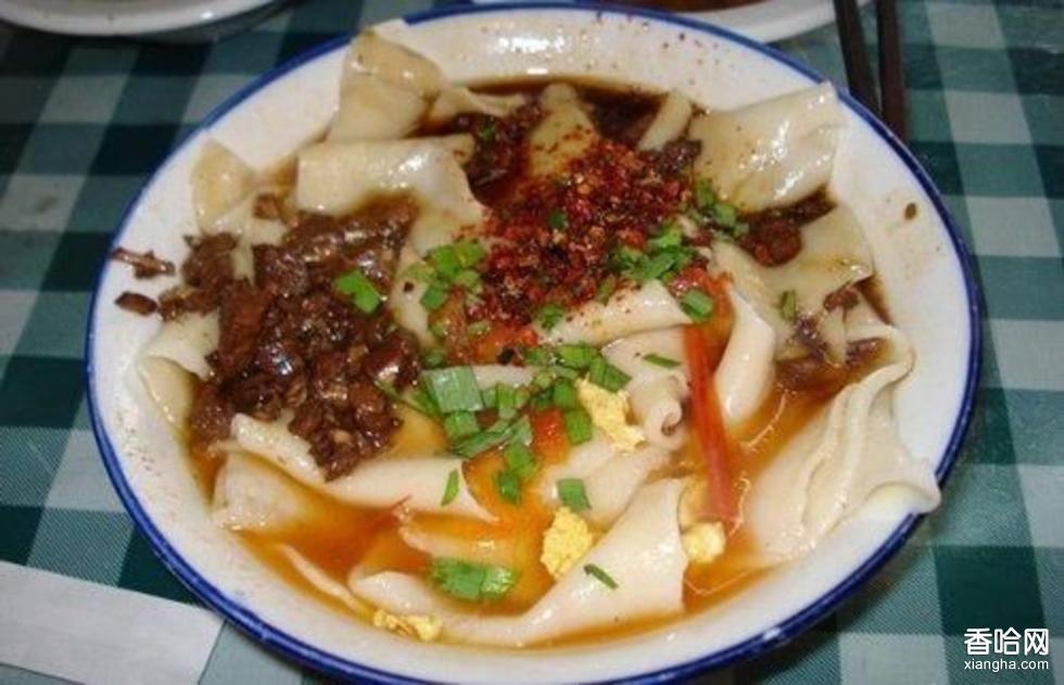作為陜西八大怪之一的面條像褲帶,俗稱 “biang-biang”。正宗褲帶面,需要用關(guān)中麥子磨成的面粉搟成,一根面條寬度可達(dá)二三寸,長(zhǎng)度則在1米上下,厚度厚時(shí)與硬幣差不多,薄時(shí)卻如同蟬翼。一根面條所用去的面粉通??蛇_(dá)2兩,因而對(duì)于飯量小的人來(lái)說(shuō),一根面條足夠一頓飯。面條光滑、柔軟,有筋性,無(wú)論是澆臊子,還是加潑油辣子,都吃起來(lái)非常帶勁。