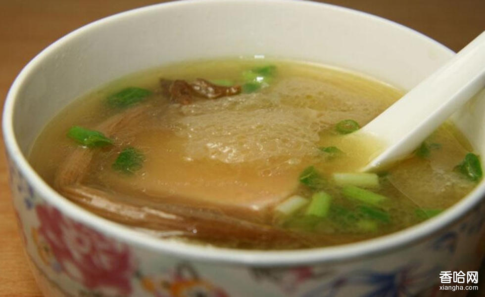制作方法:1.竹有用清水漲發(fā),洗凈,順長剖開,用平刀法切大片。再用二湯余透,撈出瀝去水分,放入湯碗中。豬肚頭用水洗凈,剔去外皮和油筋,從里面一側(cè)剞成蓑衣形花刀,刀深為厚度的 2/3.再切為 3.5厘米長,l厘米寬的塊。香菜、蔥、姜洗凈,切成末。2.炒鍋上旺火,注入清水 1000毫升,沸后下肚頭氽至半熟,用漏勺撈出,放入竹蓀碗內(nèi),同時下蔥、姜末。3.炒鍋上火,注入雞清湯,加鹽、味精、胡椒粉調(diào)好味,沸后去浮沫,迅速倒入竹蘇碗中,撤上香菜未,淋上芝麻油即成。