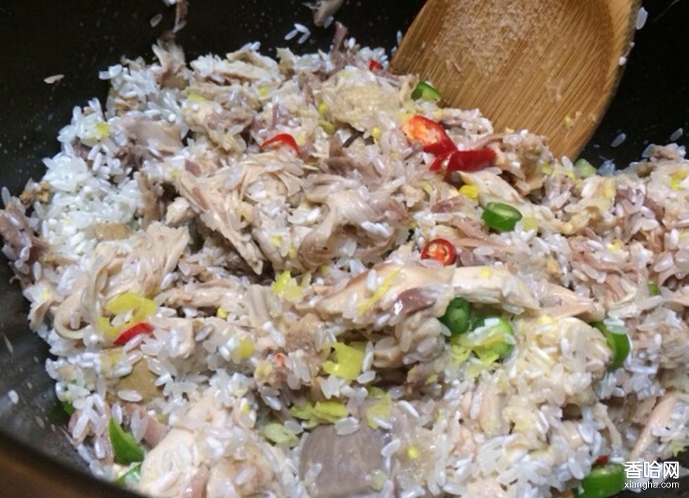 手撕雞肉爛飯的制作程序為:將收拾好的雞體在清水中煮熟,撈出雞后將淘洗好的大米倒入雞湯里煮,稍煮一陣放入一把酸筍,至大米煮爛,稠度在米飯與稀粥之間為止,端下蓋好。這時,用手將煮熟的雞肉撕碎成肉絲塊,將備好的薄荷葉、茴香、香辣蓼等切細撤在雞絲塊上,再撤上花椒面、食鹽、辣椒面,加以攪拌均勻倒入爛飯調(diào)勻即可上席使用。