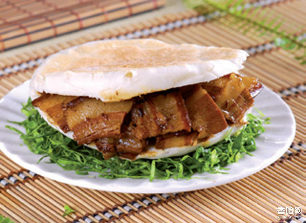 選用新鮮豬肉和傳統(tǒng)臘汁,配以花椒、大香等傳統(tǒng)燉肉佐料,經(jīng)過獨特的烹調(diào)工藝制成臘肉,煮出來的肉香而不沖、肥而不膩、熟而不爛,肉色金黃。用快刀將高莊饅頭切成薄片,把肉片、豬肚絲等夾人,形成六夾或八夾。