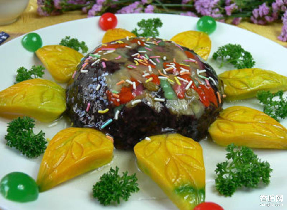 “八寶飯”是陜西筵席上的一道佳肴,以色、香、味、形俱佳而稱著。八寶飯以糯米為主料,一般多配以營養(yǎng)豐富的紅棗、蓮籽、百合、薏米、白果、桂元肉、青紅絲等蔬果。也可因時因地而異,配以核桃、山楂糕、葡萄干、花生米、蕨麻、櫻桃等副料。