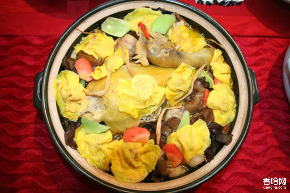 3.水海參、魷魚(yú)、香菇、玉蘭片、熟豬肚、醬肉切成小丁。生豬肉剁成肉泥,加入雞蛋4個(gè)及適量調(diào)料蒸成糕,切成丁。另將雞蛋8個(gè)磕入碗內(nèi)打散,也蒸成蛋糕,切成丁。炒鍋內(nèi)加熟豬油200克燒熱,放入姜米、蔥花炒香,再放入各種碎丁炒少許時(shí)間,加入調(diào)味品即成。另取鍋放水、母雞1只、豬骨頭若干,熬約2小時(shí),取湯備用。