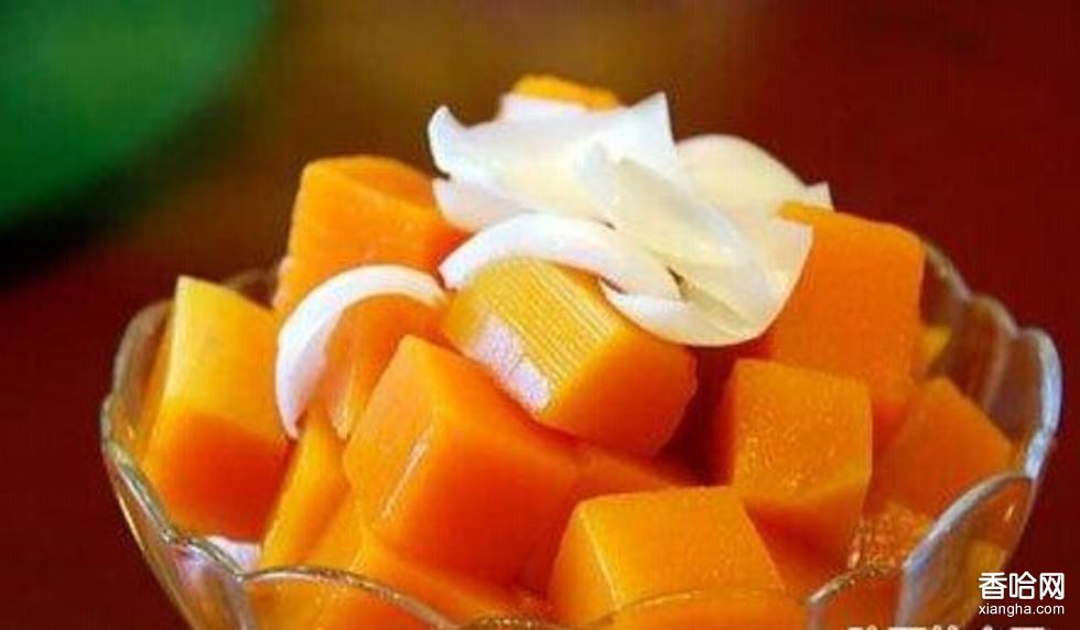 1.取一北瓜洗凈剖開,掏出瓜瓤后切成寸許方塊。