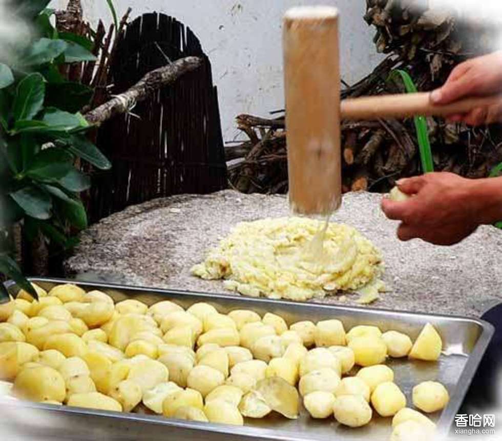 每年六七月,山里人從青青的玉米行之間挖出一筐筐新鮮的洋芋,刮皮洗凈后放于鍋內(nèi)蒸熟后舀出,然后用他們特制的一種器具來砸,所以叫做“砸糍粑”。一般在村子附近的河邊找尋一塊巨石,將蒸出的洋芋倒于石頭上,用錘子砸,邊砸邊給呈糊狀且黏成團(tuán)的糍粑撩點(diǎn)水,以便它筋道起來,等洋芋漸漸變成晶亮且又有一定黏度的面團(tuán)時(shí),再放入盆中拿回家用刀切成條狀,再配以作料比如紅紅的辣椒,青青的小蔥、大蒜等,或者再拌青菜。這樣,吃起來既有洋芋的噴香,又有青菜小蔥的清香。夏季可以涼吃,冬季可以放進(jìn)熱湯里吃。