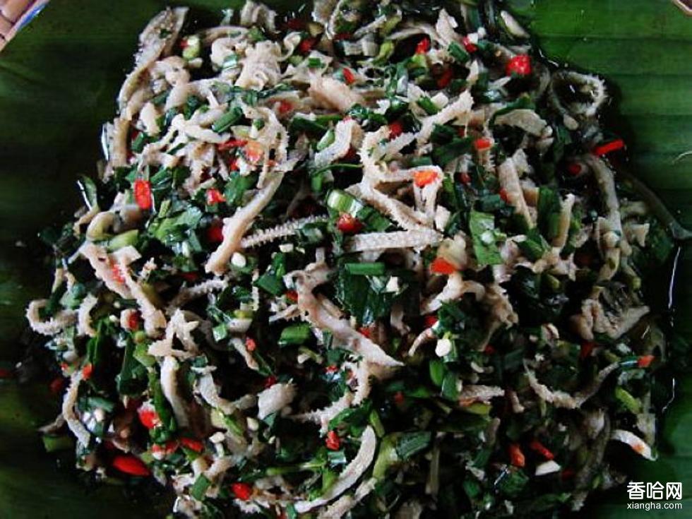 在殺牛前一個(gè)多小時(shí),給牛喂一些傣鄉(xiāng)特有的野草——五加葉和香辣蓼草。五加葉因?yàn)橹苓呴L刺,所以也叫刺五加,是一種清涼、味苦的中草藥。香辣蓼草葉型似辣椒葉,味道又辣又苦,具有殺菌的功效。牛開膛后,把牛肚洗凈,放在開水里燙兩分鐘,撈出來后快速刮洗干凈,切成條,然后放佐料;從牛胃里取出初步消化的草汁,跟牛肚拌在一起,再加上其他佐料:小米辣、花椒面、花生末、八角、草果面、味精、鹽;再放一些新鮮的切細(xì)了的五加葉和香辣蓼草,拌上從山里采來的野香蔥——牛撒撇就制成了。對了,還要加上另一種你無法想象的東西:牛的小腸里的一種很苦的汁水。加了這種苦水的牛撒撇才是風(fēng)味最地道的牛撒撇。