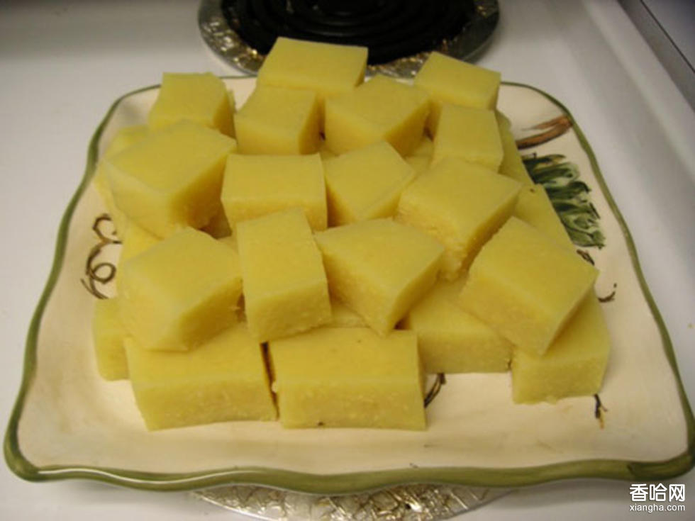 制作方法:1、頂粉:綠豆粉3公斤,面粉1公斤,白糖粉3.2公斤,豬油2公斤,食用黃色素適量加適量涼開水和成濕粉狀。2、底粉:綠豆粉10公斤,炒糯米粉2公斤,白糖粉9.8公斤,菜油6公斤,加適量涼開水和成濕粉狀。3、把篩好的面粉撒在印模里,再把頂粉和底粉按基本比例分別倒入印模里,用勁壓緊刮平,倒入蒸屜,蒸熟即可。