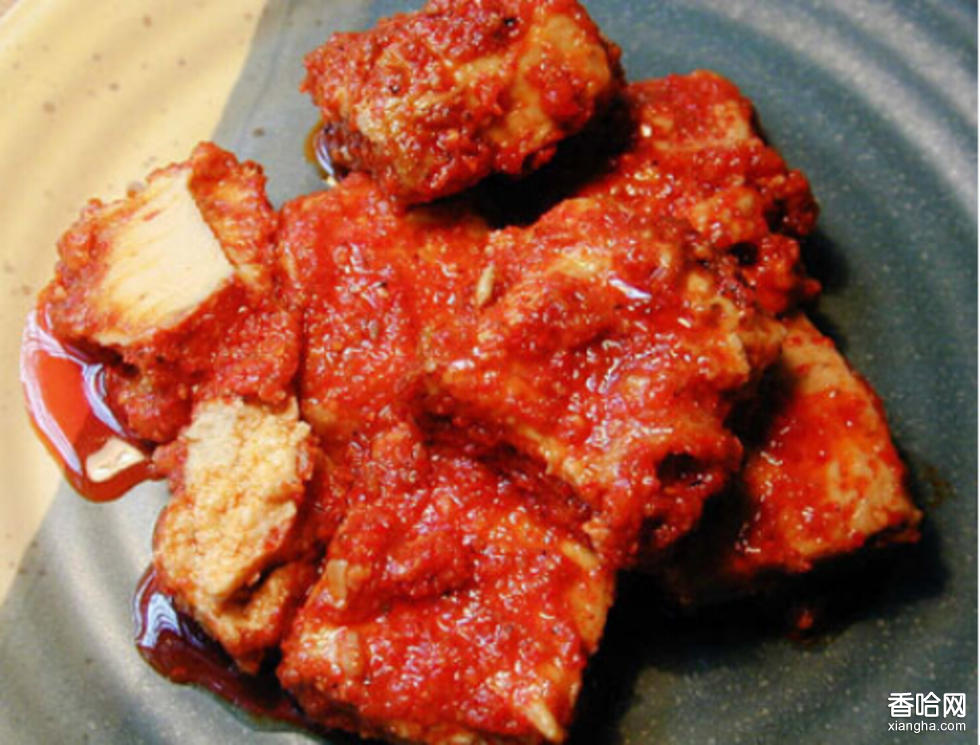 1、原料選用顆粒飽滿,汁多漿白的優(yōu)質(zhì)黃豆;作豆腐的水要用清潔的井水。2、按4—5厘米見方,2厘米厚的規(guī)格,制成發(fā)酵的毛豆腐。3、毛豆腐經(jīng)防疫檢驗(yàn)符合衛(wèi)生標(biāo)準(zhǔn)后,放在陽光下翻晾,以表皮“挺實(shí)”、內(nèi)部柔軟、曬去約20%的水份(每百斤毛豆腐晾后剩80斤左右),即成為黃白柔軟的待制品。4、然后將菜油熬熟放涼,把辣椒面,八角粉、紅糖、精鹽等佐料按比例攪拌在一起,將毛豆腐在油內(nèi)浸泡后沾裹上佐料嚴(yán)整地裝入陶罐,注入菜油使其漫過鹵腐,然后密封貯存4—6個月即可食用。
