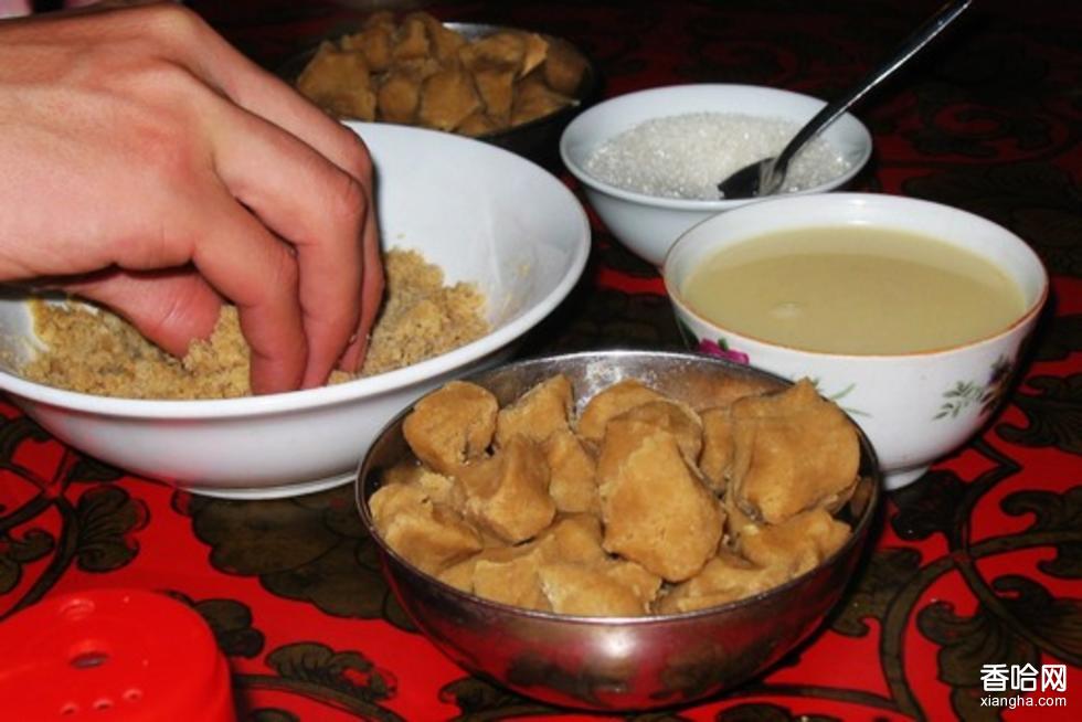 這是藏民的食品。它是以青稞磨成粉為原料,經(jīng)炒熟后,以酥油為粘合劑制作而成的。其做法是:先將酥油溶化在熱奶茶中,然后加上適量的青稞粉,攪拌成團(tuán)狀后,用手捏成形狀后直接進(jìn)嘴吃。
