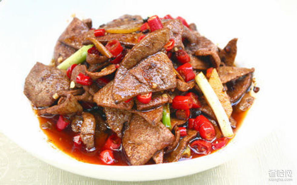 3、炒勺燒熱往油,油熱后先下辣椒、花椒,炸至黑紫色,再下豬肝片,待肝熟透即速注汁入勺,汁開后稍翻炒,滴醋,并加入炸花生米即成。