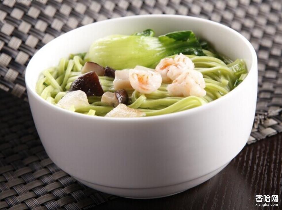 四川特產(chǎn)—青菠面,流行于川西地區(qū)風(fēng)味小吃。采用上等面粉加菠菜汁和雞蛋清調(diào)成極硬的淺綠色水調(diào)面團(tuán),揉熟后用手工搟成面條,對(duì)疊多次,切成柳葉形或細(xì)面條。青菠面色澤碧綠,面條筋而韌,綿而滑,湯鮮味美,為四川面食中的上品。