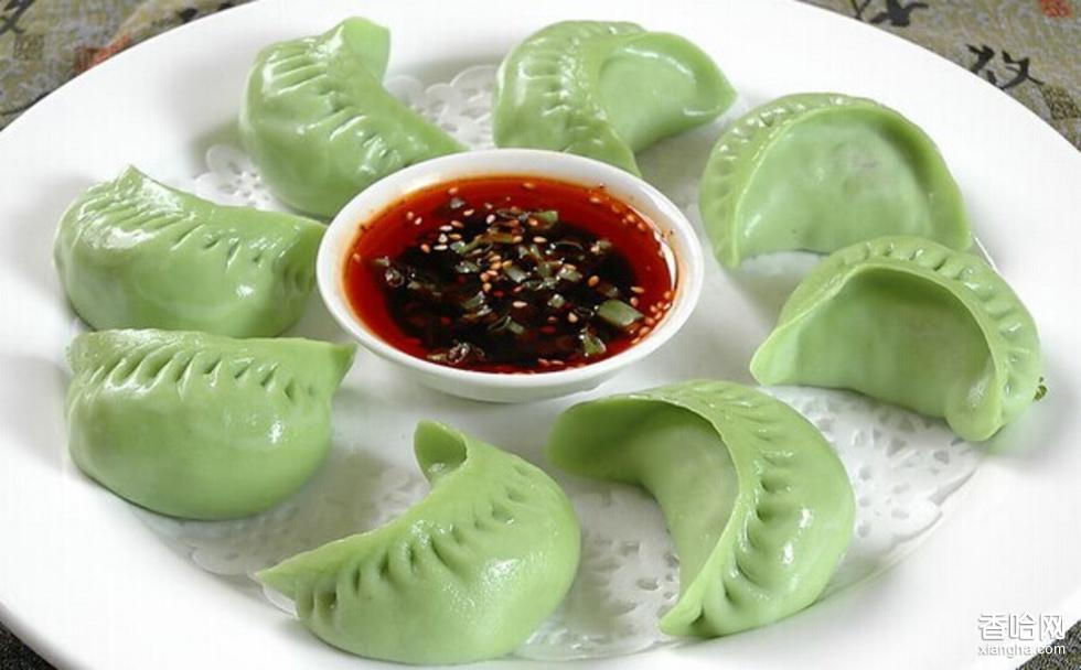 菠汁蒸餃,蒸點,特點:形似豆莢,淺綠色,餡嫩鮮爽口。烹制法:蒸。