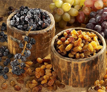 葡萄干由成熟的葡萄曬干或陰干制成,肉質(zhì)軟糯酸甜,營養(yǎng)豐富。主要產(chǎn)于新疆、甘肅,陜西、河北、山東等地,新疆吐魯番的無核葡萄干最有名。由于葡萄干內(nèi)的含水量只有15-25%,所以可以保存很久。葡萄干果糖含量很高,時間久了會產(chǎn)生少量結(jié)晶,這并不影響其食用。葡萄干可以直接食用,也可作為烹飪調(diào)料或放在糕點中。