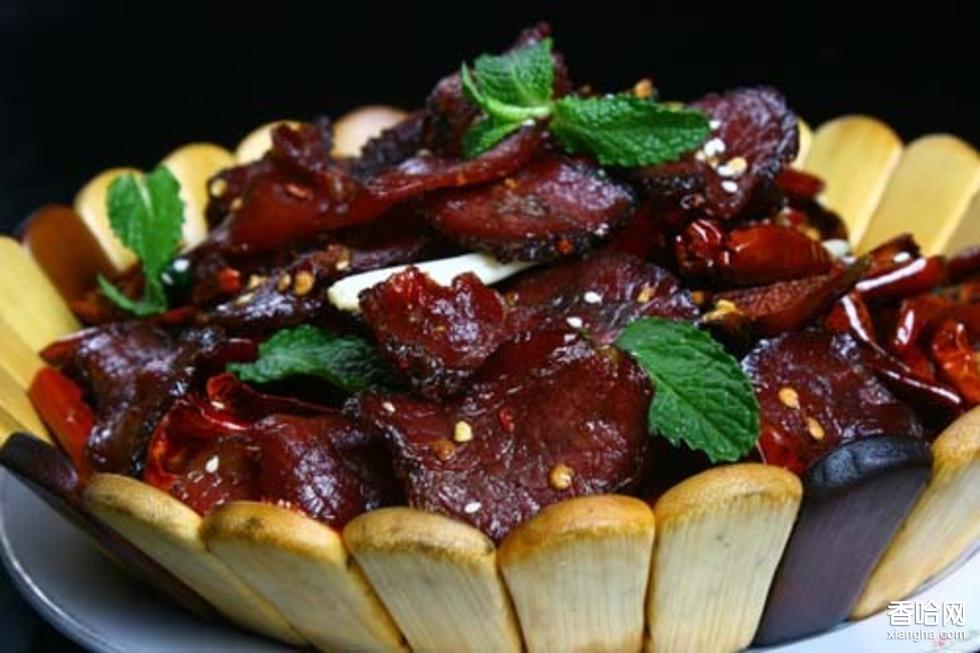 牛干巴是回族最主要的閹制肉制品,其味道獨(dú)特、營(yíng)養(yǎng)豐富,為各族群眾所喜愛(ài)。隨著人們生活水平的不斷提高,牛干巴這昔日的“富貴菜”也早已“飛入尋常百姓家”,成為頗有特色的風(fēng)味食品。牛干巴的制作工藝簡(jiǎn)單,取肥壯的牛肉(以黃牛為主)根據(jù)人們的口味配鹽、花椒、胡椒、八角、草果(這四種配料均應(yīng)打成粉末狀),用手揉搓待鹽味調(diào)料入肉后,密封15至20天,然后取出經(jīng)涼曬而成。制作牛干巴的時(shí)節(jié)主要為冬季。牛干巴可以煎炒或蒸食,也可加入蓮花菜等蔬菜炒,一般不需要再添加鹽或其他調(diào)料。由于牛干巴是閹制品,沒(méi)有經(jīng)驗(yàn)的人很難憑肉眼識(shí)別好壞、真假。因此建議人們?cè)谫?gòu)買時(shí)一定要選擇清真風(fēng)味即由回族加工生產(chǎn)的,因?yàn)榛刈迨秤玫呐H獗仨毷怯砂①暝讱⒒钆6鴣?lái),回族忌食用未經(jīng)阿訇宰殺的牲畜。這就從根本上保證牛干巴原材料無(wú)問(wèn)題。且回族制作牛干巴的工藝比較傳統(tǒng),除上述的花椒等幾種調(diào)料外,不會(huì)再添加其他化學(xué)原料