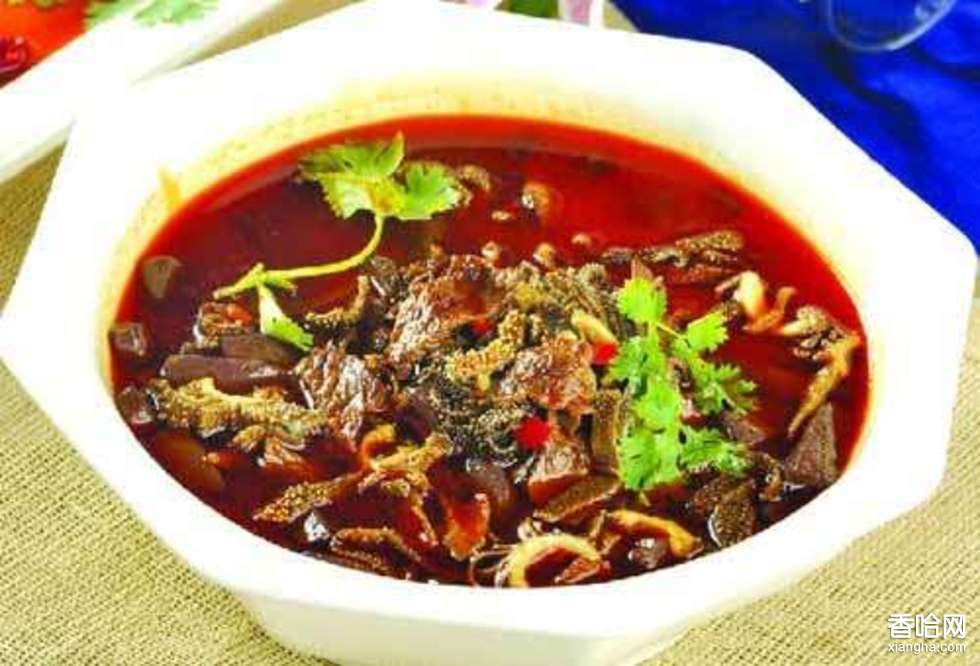 1.潑制辣椒油:選用上等干朝天椒用絞餡機(jī)絞碎,納入瓷盆中,澆入燒至七八成熱的牛油(一般500克辣椒,需用牛油1500克)。一邊澆油,一邊用竹筷迅速將辣椒與牛油攪勻2.腌制牛肉:選用公黃牛凈肉10千克,分割成1千克左右的小塊。凈鍋上火,摻入清水5千克,放入大料50克、桂皮25克、花椒20克、生姜片100克、小茴15克、香葉10克,大火燒開(kāi)后改用小火熬30分鐘,至香味四溢時(shí)離火晾涼,打去料渣,把5克硝鹽溶化其中,制成香料水。取凈桶,放一層牛肉后灑適量香料水,再撒上一層食鹽,再放牛肉,再灑香料水,以此方法把牛肉腌完,最上面要多撒些食鹽,然后把桶口蓋好,待48小時(shí)后便可取出,用清水清洗干凈。3.熬湯、煮料:取一口大鍋,鍋中放一個(gè)瓦圈(瓦圈形狀下大上小,其用途是起分隔作用,圈外煮牛肉,放香料包等,圈內(nèi)專供煮水餃和燙制三合湯所用),摻入清水,再放入焯水后的牛腿骨兩根,適量腌制好的牛肉和一剖兩半的新鮮大白蘿卜,以及香料包(香料包里有大料、桂皮、花椒、辣椒節(jié)、生姜片、三柰、草果、小茴、香葉等),燒開(kāi)后下入蔥段,調(diào)入料酒、精鹽、雞精、牛油,用中火熬30分鐘后,撈出蘿卜,再煮1個(gè)小時(shí)后,撈出牛肉,鍋中已帶有香鮮味的湯汁即可用于燙制三合湯。4.制作水餃:把煮熟的蘿卜晾涼后,再加適量新鮮牛肉一起剁細(xì),納盆,調(diào)入姜末、蔥末、芹菜末、蒜苗末、精鹽、胡椒粉、味精、雞蛋液攪成餡;用精面粉制成餃子皮后,取餡包成餃子(鄖陽(yáng)人稱此種水餃為“猴頭”)。5.燙制三合湯:先將煮熟的牛肉晾涼切薄片;紅薯粉條用溫水泡軟;香菜、蒜苗切碎末。