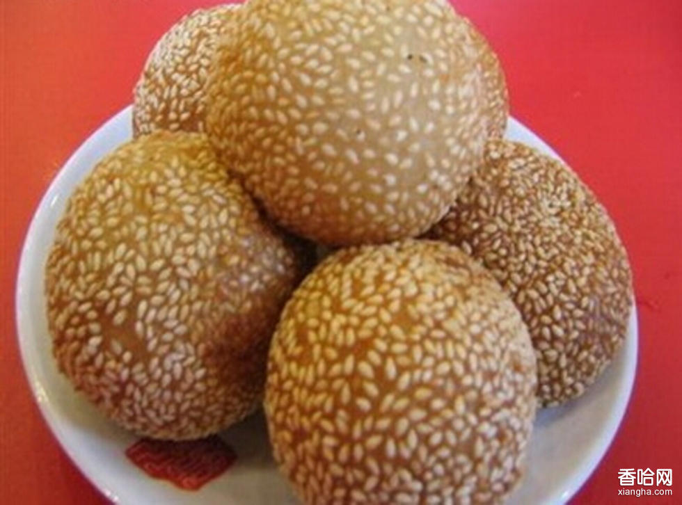 2制作方法:炸。糯米淘洗干凈浸泡后,加水磨成米漿裝入布口袋吊起,待水分濾干后放置4-5小時,讓吊漿面自然發(fā)酵至略有酸味后,加堿、糖揉勻搓成長條,下每個約重25克的劑子20個,搓成圓球形后,粘上芝麻入溫油鍋中炸,邊炸邊用平漏勺背反復(fù)踏壓炸至泡空起來,殼呈金黃色即可。