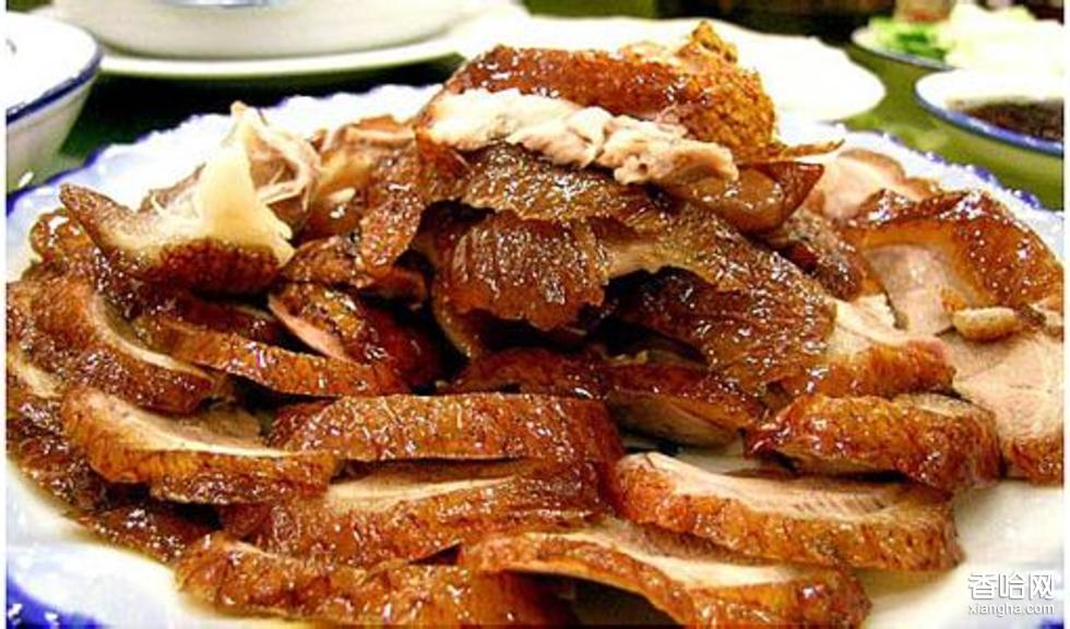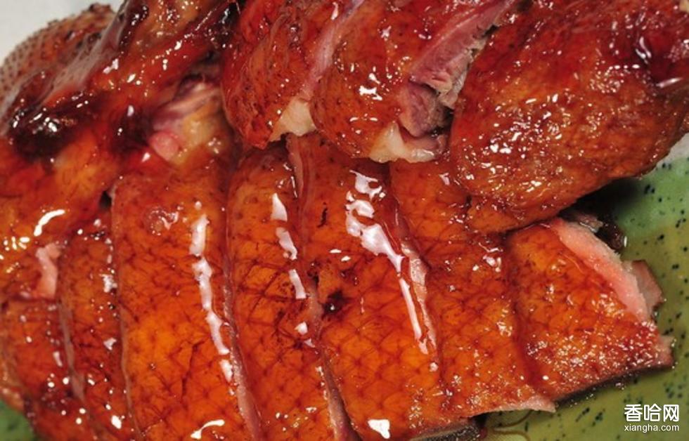 4、將鹵熟的鴨子撈起控干水分,用滾油一勺勺的淋熟至皮酥且呈棕紅色時撈出,刷上飴糖即成。