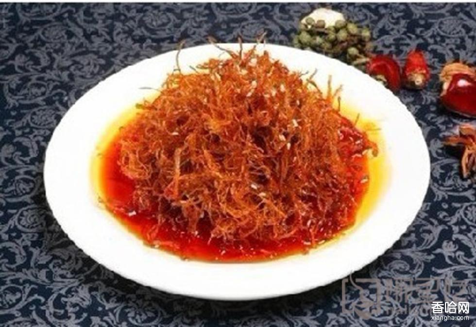 2、將牛肉絲放入油鍋內(nèi)炸酥撈出,加入白糖、味精、紅油辣椒、花椒油、香油拌勻,裝盤即成。