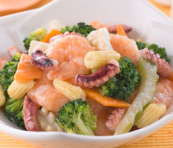 原料:鮮蝦,西蘭花,胡蘿卜,海鮮菇,蒜,鹽,生抽。
