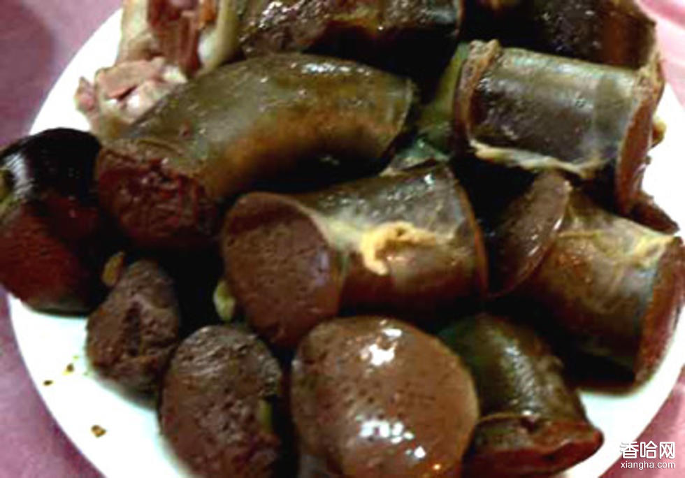 豬血腸也叫“豬龍棒”,又叫“豬龍碰”。 是農(nóng)家每年臘月殺豬后必不可少的一道菜肴。