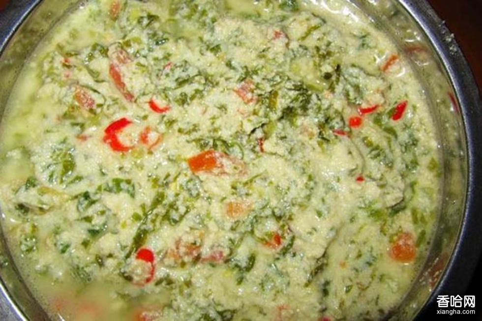 “瑤豆腐”的制作并不像漢人制作豆腐那么復(fù)雜。古時沒有電,加工糧食在壯家瑤寨里主要靠“碓”。用一只腳一下一下的踩,“碓嘴”在石坎中慢慢的一下又一下舂,把玉米、谷子、黃豆的顆粒倒入石坎中重新再舂,如此來回數(shù)次,才能舂好。宜州舊時民謠:“妹呀妹”嫁到北山背。手攀墻,腳舂碓。哥哥騎馬去接妹,家公家婆不給回,扯起圍裙抹眼淚?!庇纱丝梢姟笆峙蕢Γ_舂碓”這種繁忙笨重的體力勞動千百年來壓得壯家婦女喘不過氣來。她們周而復(fù)始的天天舂,舂谷子、舂玉米、舂黃豆,保證全家人一天的食用。做“瑤豆腐”的基本原料也是用碓舂出來的。經(jīng)過來回幾次舂篩之后,得出很細(xì)的黃豆粉,架鍋、裝水、生火,一只手拿筷條慢慢運(yùn)攪動,另一只手抓黃豆粉均勻地灑入鍋中,不能讓豆粉在水中“結(jié)子”,越攪得均勻越好,直到沸騰,仍然繼續(xù)攪動。鍋里的水漸漸由稀變稠,說明黃豆粉已熟八成,此時把切碎了的任何一種蔬菜的葉子加人“糊”中,仍不停地攪動,使之混合均勻,等到菜葉熟了,加人蔥花、辣椒,少許米醋,最后放鹽,再攪勻后,蓋上鍋蓋,退火。不久,黃豆粉就會凝結(jié)在鍋邊和菜葉上,像一朵朵、一串串的“桂花”,即可吃。經(jīng)濟(jì)寬裕的人家加葉的同時,加入肉松,其味更甜滑、口感更好。這就是散發(fā)著黃豆原汁原味芬芳的“瑤豆腐”。