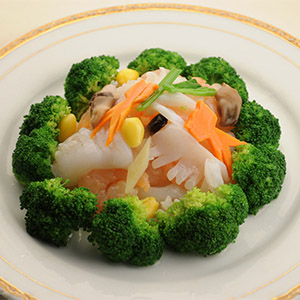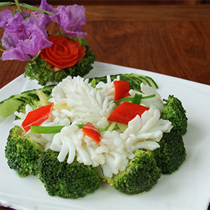 4、燒熱鍋下入花生油,放姜片、胡蘿卜片、西蘭花、魷魚片、鹽、味精、白糖同炒,用濕生粉打芡,淋入麻油翻炒幾下出鍋即成。