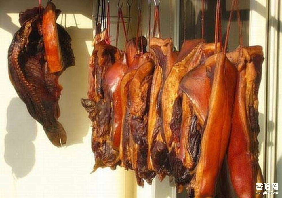 特點(diǎn):臘肉色澤金黃、瘦肉醬紅。咸度適中,臘香濃而無(wú)煙味。制法:(1)將鹽炒熱、晾涼,加硝和香料拌勻,擦抹在肉上,放一缸內(nèi),把剩下的鹽和香料,均勻撒在上面,腌制2--3天后翻缸,翻后再腌2--3天出缸,洗凈晾干。(2)將腌好的肉放入“烘房”內(nèi)(房?jī)?nèi)溫度保持在113℃左右),烘1--1天半左右,待皮干硬即成。