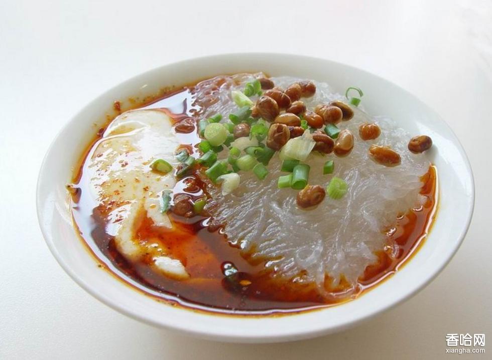 紅苕粉制成細(xì)粉條,入鍋燙熱,裝碗(每碗30克),舀上豆腐腦,放醬油、姜末、醋、辣椒油、蔥花、味精、麻油、油酥黃豆等調(diào)料即成。
