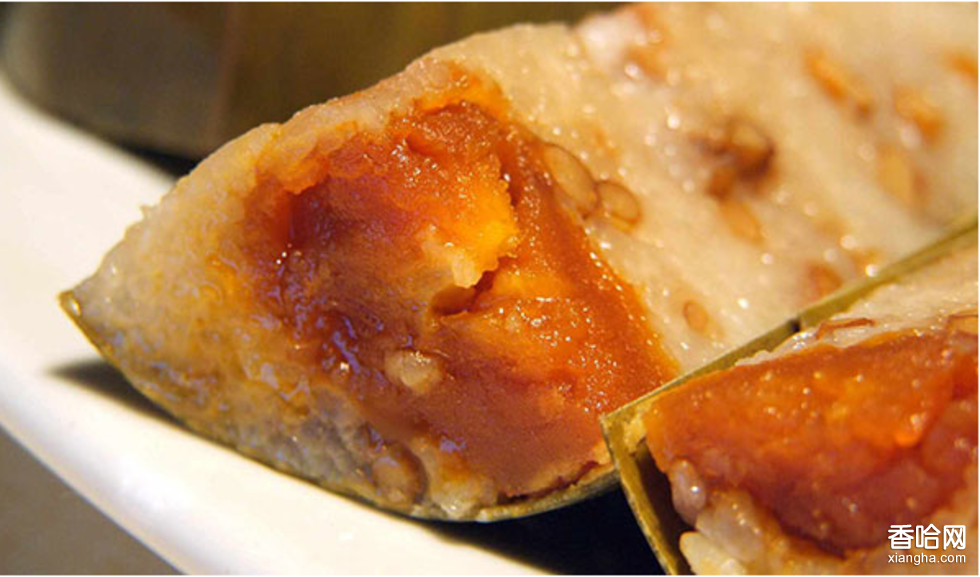 糯米洗凈,用微量精鹽、生油、拌勻,夾以燒腩肉(粵菜中一種燒臘制品)、咸蛋黃,用圓水草綁扎;粽呈圓筒狀,兩頭交錯一字平口,一般直徑12厘米,長30厘米。先燒滾水,放入粽,文火煮4小時,中間添些開水,收火浸于湯內4小時,前后要在開水中燒上10個小時,食之味香韌滑。
