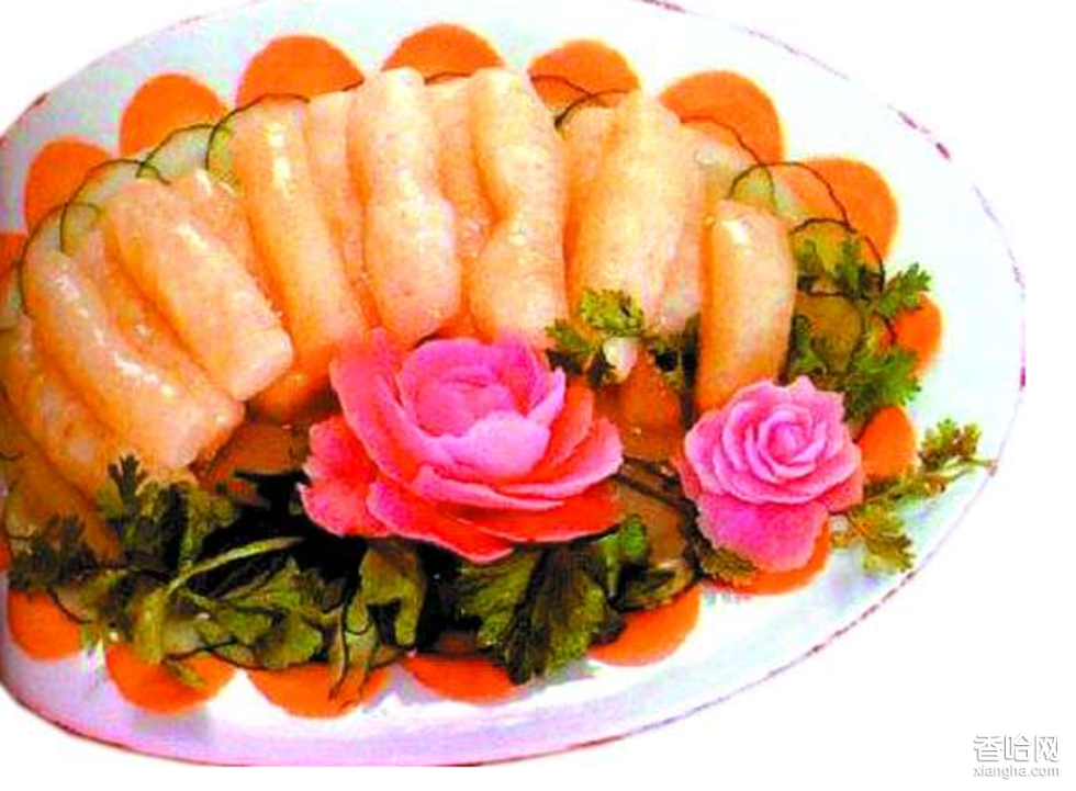 把姜薯用刀切成片,放進(jìn)蒸籠炊熟,炊熟后趁熱倒在砧板上,用刀壓爛,揉壓成姜薯蓉待用。再將糖冬瓜片、橘餅用刀切成幼絲。豬網(wǎng)油用清水漂洗干凈,攤開泌干水分待用。將姜薯蓉加入白糖50克進(jìn)行攪揉,攪至白糖稍溶化時,再加入冬瓜片絲、橘餅絲稍拌壓均勻。然后把已洗好的豬網(wǎng)油攤開,撒上生粉,把姜薯蓉分別放在豬網(wǎng)油上,包成約5厘米長、2.5厘米寬的卷形狀,便成姜薯卷。先將雞蛋白用筷子攪拍均勻候用,再把每件姜薯卷分別先蘸上雞蛋白,后粘上生粉,用手稍壓實待用。將炒鼎洗凈燒熱,放入生油,候油熱至約180攝氏度時,把姜薯卷放進(jìn)油中炸至透心撈起,用餐盤盛著。把鼎內(nèi)的生油倒回,將鼎洗凈,放入清水50克和白糖100克用慢火煮成糖油,淋在姜薯卷上面即成。