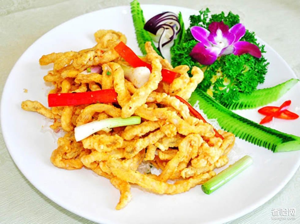 沙蟲(chóng)形似腸子,又名沙腸蟲(chóng),生活在海邊的沙地里,味道鮮美脆嫩,是北海一帶的特產(chǎn)。一根小木簽將沙蟲(chóng)腹部刺破,將腹內(nèi)的沙土及內(nèi)臟清洗干凈,再反復(fù)用清水將表面的滑漿洗凈,佐以蔥姜,以大火快炒,色白如雪,入口香脆帶甜,保有一些咬勁,堪稱稀珍。海邊的農(nóng)家或者海鮮大排檔均有賣。
