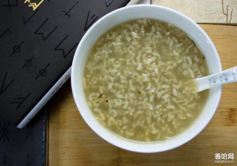 桂西一帶壯族民間夏令食品。艾草清香味微苦,具有溫氣血、祛寒濕、增進食欲的功能。當?shù)厝罕娒康较奶?,都喜歡采摘鮮嫩的艾葉,洗凈放入鍋中與大米一起煮粥食。