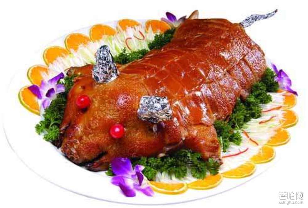 3、小火入燜爐烤約兩小時取出,再將香豬放在明爐上,把豬皮烤至金黃色。上桌時切成骨牌大小。
