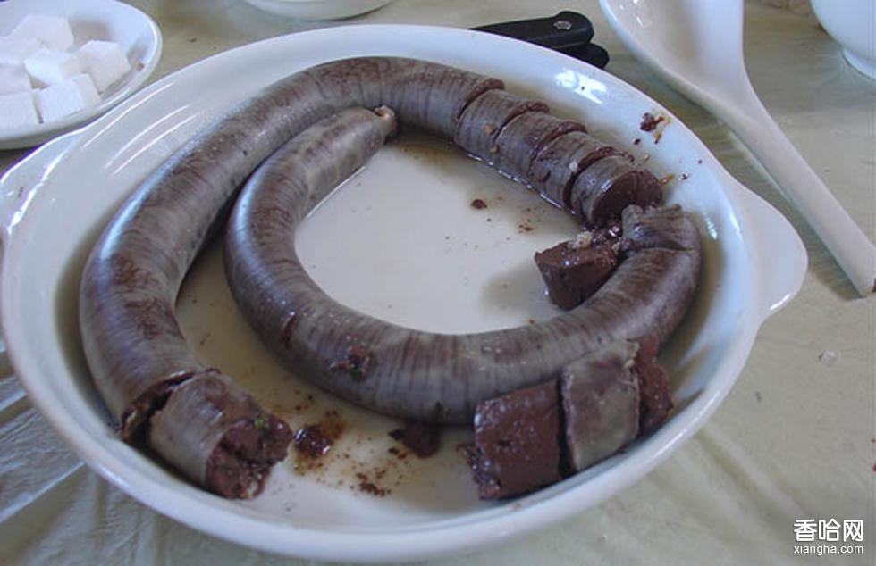 是桂中、桂西北壯族人民非常喜愛的一種傳統(tǒng)美食,壯語音譯,本義為血灌得腸子,按照漢語的語音卻成了很形象的解釋,煮熟的龍棒,盤曲似龍,伸直像棒,這個音譯可謂音形完美結(jié)合。龍棒一般分為豬龍棒和狗龍棒。