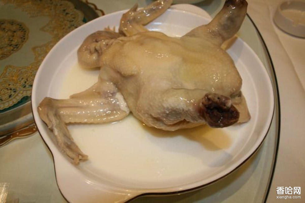 1.將土雞宰殺,去內(nèi)臟、凈血,放入50℃一60℃的熱水中燙透(2-3分鐘),撈出,用鑷子夾凈雞身絨毛,待用。