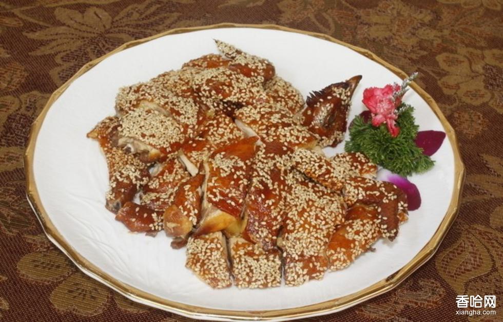 芝麻香雞是一道傳統(tǒng)的漢族名菜。雞脯肉用刀背砸成茸泥,生肥膘也剁成泥,熟肥膘切丁,一起入盆,加雞蛋清、調(diào)味品及濕淀粉,拌勻,再將熟凈荸薺拍碎摻入,攪拌成雞締子。然后,將雞締子拌在咸面包片上,上粘芝麻,放在植物油中炸至金黃色熟透時撈出,切成一字條,吃時沾花椒鹽