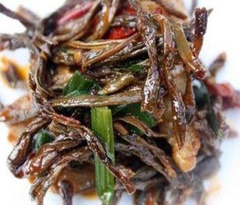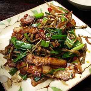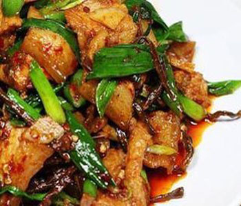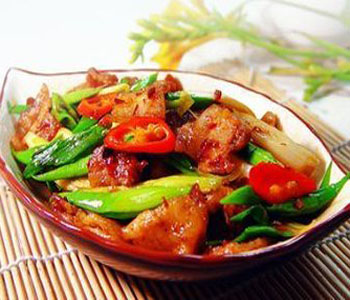干豇豆回鍋肉 這道菜的主要原料:五花肉帶脆骨、干豇豆。它所需的配料有以下這些: 蒜苗、仔姜、蒜瓣、燈籠椒、花椒。同時(shí)它所要用到的調(diào)料有:老干媽、豆豉、豆瓣醬、白蘭地、糖、雞精?,F(xiàn)在我們來說一說這道菜的具體做法吧。首先,五花肉用開水煮熟晾涼切片,干豆角泡發(fā)切小段,姜切絲,蒜切片,辣椒切圈,新鮮蒜苗切段備用;其次,鍋熱注油下豆瓣醬煸出紅油,放姜,蒜干辣椒一起爆香,再放五花肉煸炒至微卷;然后,放老干媽一起炒勻,再放干豆角一起炒2分鐘左右,放一點(diǎn)白蘭地(白蘭地倒入鍋內(nèi),整個(gè)鍋瞬間就冒起大火啦,小心別嚇到);最后,加一點(diǎn)白糖,雞精,最后放入蒜苗炒至斷生即可。一步一步地來進(jìn)行,做烹制的過程中我們要有足夠的耐心,這樣美味的菜肴才能夠烹制成功。