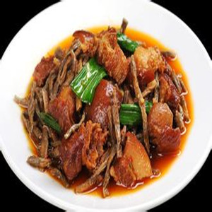 食材:五花肉500g、干豇豆80g、大料4粒、蔥一根、姜一塊、冰糖15g、生抽10mL(毫升)、老抽10mL、鹽適量。