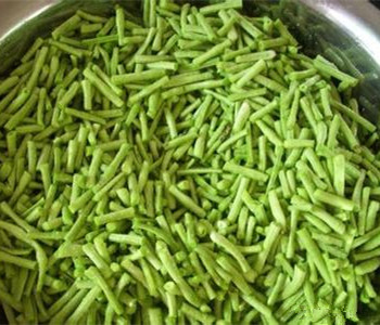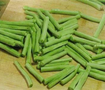 2、炒鍋洗凈置旺火上,放油燒至七成熱,下豇豆,炸至皺皮時(shí)撈出,瀝干油份待用。