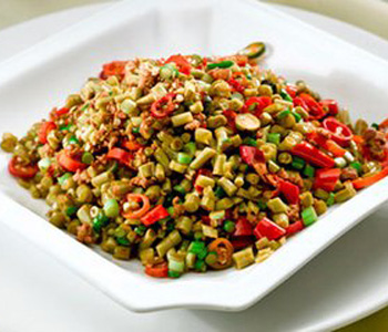 6、熱鍋,放入一小匙油燒熱,放入辣椒及作法1的酸豇豆末炒勻,并加入調(diào)味料煮至略微收干即可。