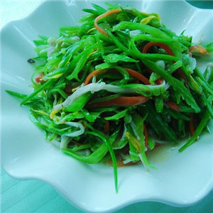 具體做法:把新鮮挑選的荷蘭豆擇去老筋洗凈,胡蘿卜去皮清洗干凈,這個(gè)用法添加的胡蘿卜是因?yàn)楹}卜可以做成的涼拌荷蘭豆紅綠相間,賣相更好看。鍋內(nèi)水燒開后放入荷蘭豆焯水。把焯過(guò)水的荷蘭豆放入涼水中過(guò)涼備用。荷蘭豆和胡蘿卜切成絲后,把切好的絲放入小盆中,放入蒜末、香油、味精、鹽、少許醋和糖。最后攪拌均勻就可以了。