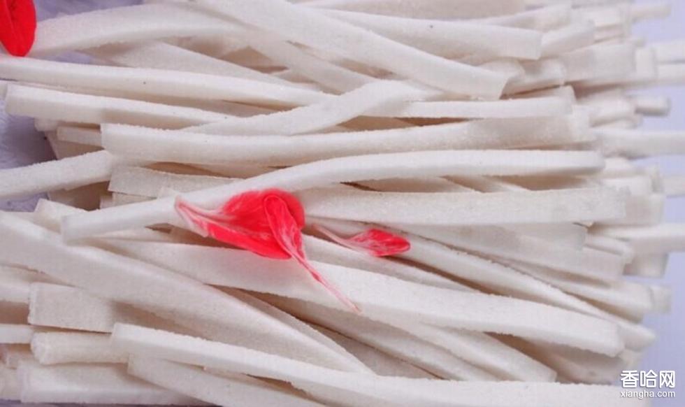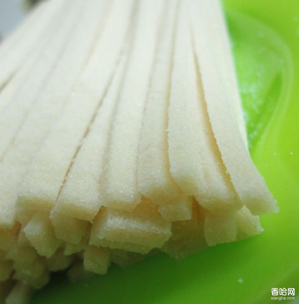 6.成型:先將一半糕粉裝盆,進行舂糕,從盆角舂向中心,要求用力均勻,舂跡相連。 舂好后添加糕粉,到舂滿為止,最后沿盆邊用利刀削平,再平行切成四條,每刀均切到底,然后抽去盆底板,使整糕落在案板上。用白紙將切好的糕塊包好,置于潔凈的木桶中保溫12小時,桶口用絨布覆蓋(蓋幾層視氣溫而定)。加產(chǎn)量大,則可排在木板上放進密封木倉中保溫。將經(jīng)過保溫處理的糕塊,切成4毫米厚的片再切成3毫米寬(長86毫米)的長絲。切片時撒少許熟秈米粉,以防粘連。