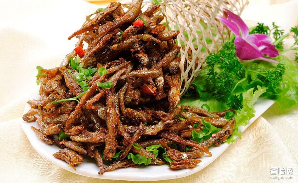 (2)制作方法:取小魚焙干,過大油,烹制入味裝盤。