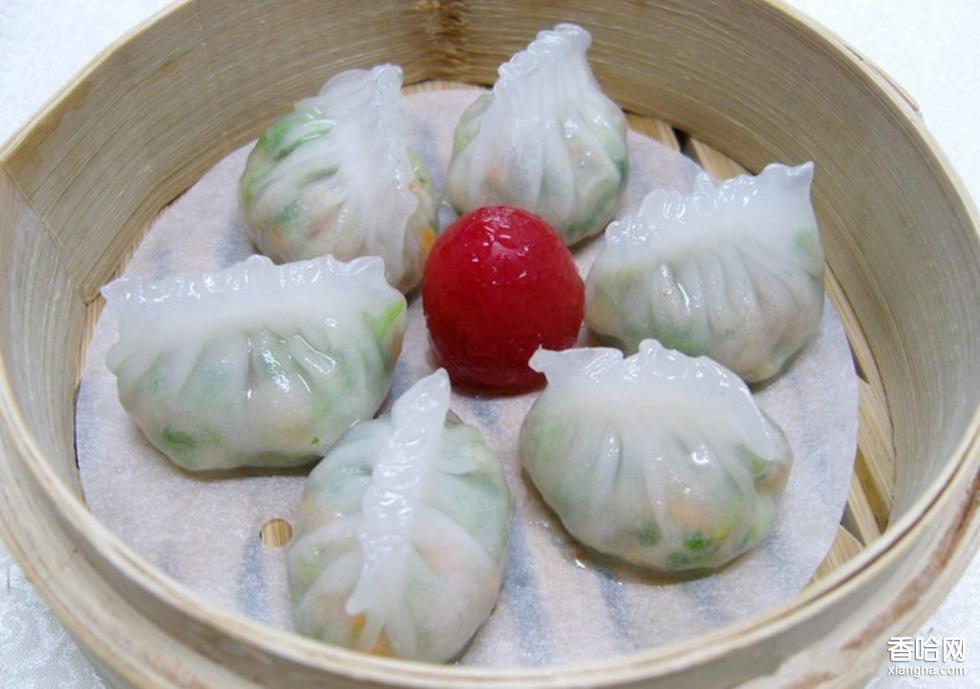 蝦餃,透明玲瓏,滑爽鮮美。是廣東茶樓、酒家的傳統(tǒng)美點。廣東人飲茶,少不了來一籠蝦餃。上乘的蝦餃,皮白如冰,薄如紙,半透明,肉餡隱約可見,吃起來爽滑清鮮,美味誘人。蝦餃最早出現(xiàn)在廣州郊外靠近河涌集市的茶居。那些地方盛產(chǎn)魚蝦,茶居師傅再配上豬肉、竹筍,制成肉餡。當(dāng)時蝦餃的外皮選用粘(大)米粉,皮質(zhì)較厚,但由于鮮蝦味美,很快流傳開來。城內(nèi)的茶居將蝦餃引進,經(jīng)過改良,成為廣州的名點,歷久不衰。